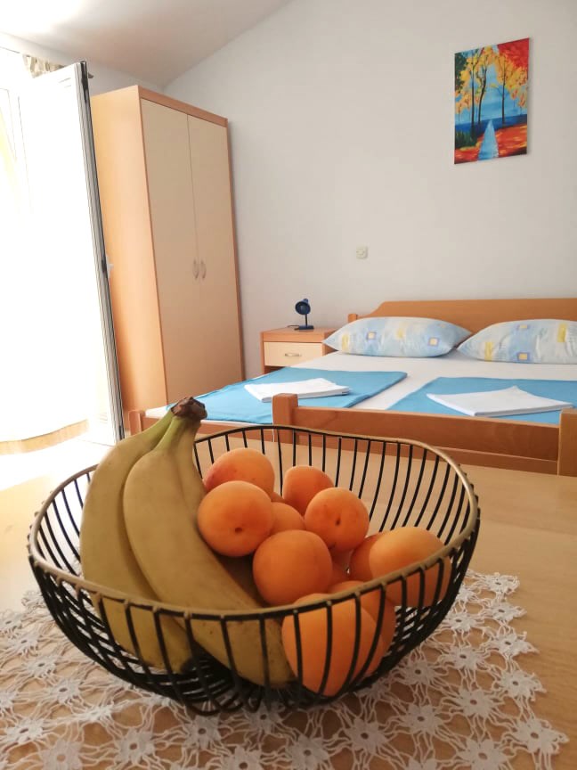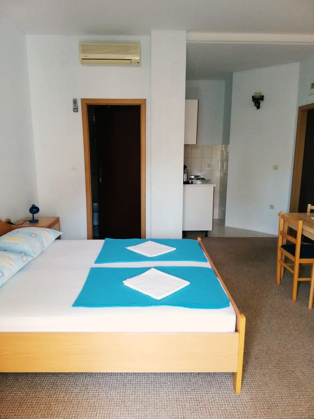 Štúdio 1/2Dvojlôžková izba spojená s plne vybaveným kuchynským kútom, kúpleňou (sprcha a WC), klimatizáciou, SAT TV, wifi a balkónom.Štúdio 1/2+1Dvojlôžková izba s jednou prístelkou vo forme rozkladacieho gauča vhodného pre jednu dospelú osobu alebo dve deti do 12r. spojená s plne vybaveným kuchynským kútom, kúpelňou (sprcha a WC), klimatizáciou, SAT TV, wifi a balkónom.Apartmán 1/2 + 1Spálňa s manželskou posteľou, samostatná obývacia izba s rozťahovacím gaučom pre 1 dospelú osobu alebo 2 deti do 10 rokov, plne vybavený kuchynský kút, kúpeľňa (sprcha a WC), klimatizácia, SAT TV, wifi a balkón.